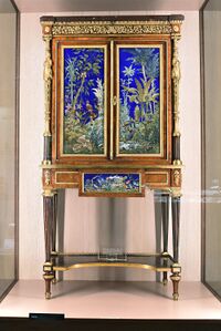 Коллекция Поделочные и драгоценные камни, №5381. Лазурит, яшма, амазонит, лабрадорит, мрамор, и др. Шкафчик из дерева амбоин со вставками. Мозаика из различных поделочных камней, по рисунку, полученному о французского фабриканта Анри Дассона. Работа русских мастеров Петергофской гранильной фабрики (период 1884-1892 г.г.). В 1893 г. демонстрировался на Всемирной Колумбовой выставке в Чикаго. Сохранилась записка реставратора камнерезных вещей Эрмитажа И.П. Андреева, где говорится, что после ликвидации личного музея императора Александра III в Аничковом дворце (Музей города 1917-1935), где находися кабинет (и еще два подобных), трест "Русские самоцветы" отправил их вместе с другими вещами в Москву.В записке говорится,что на Петергофской фабрике еще в 1919 г. ходили слухи,что шкафчики хотели приобрести американцы. За каждый предлагали по 25 паровозов.Будто бы после осмотра шкафчиков Ленин запретил эту сделку (Мавродина, 2007, с, 154; М.Б. Чистякова "Новые данные о минералах". 2011. В. 46, с. 19,20). Длина экспоната 170 см.