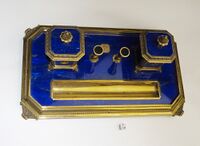 Коллекция Поделочные и драгоценные камни, №7248. Подставка-лоточек с двумя чернильницами (3 предмета из письменного прибора) лазурит, стекло, золото. Вес 2355 г. Золото 700 г. 375 пробы. Длина экспоната 32 см.