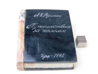 Коллекция Поделочные и драгоценные камни, №7330. Сувенир в виде книги А.Е.Ферсмана "Путешествие за камнем". Уфа 1982 г. Обложка - яшма, страницы - мрамор. Длина экспоната 7 см.