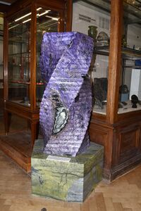 Коллекция Поделочные и драгоценные камни, №8258. Чароитовая ваза современной работы, высотой 850 мм, диаметром 38 см в поперечнике и весом 196 кг. Выполнена из цельного блока чароитовой породы с вкрапленниками микроклина, альбита, эгирина, тинаксита и кварца. Ваза имеет пятигранное сечение, а ее вертикальные поверхности "закручены" в спираль. Полая часть вазы диаметром 20 см и глубиной 30 см от верхнего края вазы. Длина экспоната 85 см.