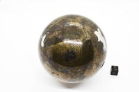 Коллекция Поделочные и драгоценные камни, №8282. Полированный пиритовый шар с включениями кальцита диаметром 90 мм, с эффектом астеризма: лучи выходят из шара в двух диаметрально противоположных точках-полюсах. Ещё в четырёх точках по экватору, расположенных ~ через 90 градусов проявляется более слабый астеризм.
