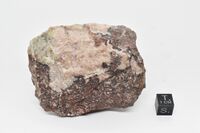 Коллекция Коллекция В.И.Степанова, №1969. Красно-бурый мелкозернистый агрегат паризита в паризит-кальцитовой псевдоморфозе по изометричным кристаллам среди грубозернистого флюорит-кальцитового агрегата.