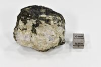Коллекция Коллекция В.И.Степанова, №3222. Выделения перламутровых пластинок бавенита в кальцит-флюоритовом прожилке с эпидотом в амфиболитовом сланце. Длина экспоната 5.5 см.