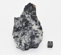 Коллекция Коллекция В.И.Степанова, №6944. Обрезанный с одной стороны образец серого среднезернистого агрегата котоита содержащего отдельные кристаллы и сферолиты людвигита (10% содержание Al). Длина экспоната 11 см.