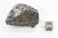 Коллекция Коллекция В.И.Степанова, №8205. Вкрапленность чешуек молибденита в кварцевом прожилке с халькопиритом. Длина экспоната 6 см.