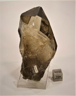 | Наглядный пример регенерации хорошо образованного кристалла темно-дымчатого кварца. Кристалл был сломан в результате каких-то естественных процессов, но благодаря наличию источника питания, был запущен процесс регенерации. Новая группа ориентированных кристаллов стала расти на месте излома. Данный образец интересен тем, что на изломе одиночного кристалла дымчатого кварца формируется группа бесцветных, что указывает на изменение состава питающих растворов. |