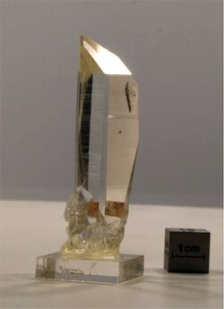 | В зависимости от условий роста, кристаллы кварца могут приобретать различный облик. На форму кристалла влияют такие факторы, как скорость изменения температуры, состава среды, характер поступления питающего материала и пр. На фото бесцветный прозрачный длиннопризматический кристалл кварца - горного хрусталя. Этот образец из дореволюционных поступлений, добыт во Франции, это настоящий горный хрусталь – бесцветный, идеально прозрачный кварц. Название «горный хрусталь» ввел в употребление древнегреческий ученый Теофраст. Происходит оно от греческого «кристаллос» - лед. «Лед, спрессованный временем и давлением ледников» - такого мнения о происхождении горного хрусталя придерживались великие умы античного мира: Плутарх, Аристотель, Плиний Старший, и лишь в XVII веке знаменитый английский физик Роберт Бойль окончательно и четко определил горный хрусталь как минерал. Античные жрецы с помощью линз из этого минерала зажигали ритуальный огонь, а лекари прижигали раны. Любопытны мифологические и религиозные представления о происхождении горного хрусталя в разных точках земного шара – японцы считали этот камень замерзшим дыханием дракона, в зороастризме небо сделано из горного хрусталя. |