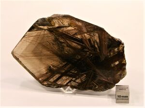| В этом образце рутил располагается не внутри, а на поверхности граней кристалла кварца. Рутил образует так называемую сагенитовую сетку ориентированных кристаллов, замещающих ильменит.