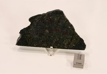 | Фрагмент нодуля серпентинизированного гранатового лерцолита из кимберлитов трубки Удачная, Якутия. Лерцолит состоит из округлых (до 1 см) ярко-малиновых зерен пиропа, небольших зеленоватых зерен пироксенов и интенсивно серпентинизированного оливина. Зерна пиропа представляют собой овальные вкрапленники — порфирокласты, заметно отличающиеся размерами и формой от остальных минералов в породе, испытавшие давление и дробление. Такая структура пород называется порфирокластической. По периметру нодуля заметна реакционная зона (~0,5 см). На выставке представлен также большой шлиф. | |