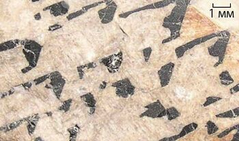 Черный пикроильменит (Fe2+,Mg)(TiO3)2 находится в закономерном срастании с сильно измененным светлым клинопироксеном — диопсидом CaMg[Si2O6]. Такие срастания называют графическими или письменными, так как темный минерал на светлом фоне напоминает клинопись или древние руны. Эти срастания — результат распада первичного клинопироксена с высоким содержанием Ti. С понижением температуры Ti выделился в самостоятельную фазу, образовав пластинки пикроильменита, закономерно ориентированные в кристалле клинопироксена. Новообразованного вещества не хватило для формирования целых полногранных кристаллов, образовались только отдельные грани — так называемые скелетные формы. Этот редкий ксенолит размером всего 2,5 см был найден в кимберлитах трубки Сытыканская, Якутия. Согласно исследованиям, первичный, богатый Ti клинопироксен образовался в верхней мантии и был устойчив на глубинах порядка 200 км при температурах более 1270°С. Постепенное перемещение клинопироксена в более высокие горизонты сопровождалось понижением температуры и давления. Распад первичного клинопироксена произошел при 1150°С. Подробно прочитать об этом можно в статье: А.И. Пономаренко «Происхождение ильменит-клинопироксеновых сростков (ксенолиты из кимберлитовых трубок)». ДАН, том 235, №5, 1977г.