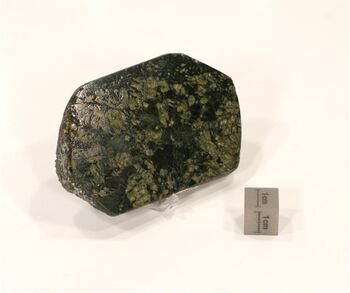 | Образец плагиоклазового лерцолита из офиолитов — реликтов древней океанической коры, тектонически перемещенных на окраины материков. Образец был найден на массиве Сьеницкий Озрен, Главный офиолитовый пояс Динарид, Сербия. Порода состоит преимущественно из слабо серпентинизированного мелкозернистого оливина с зернами орто- и клинопироксенов. В породе присутствует плагиоклаз (Na,Ca)Al(Al,Si)Si2O8 в виде цепочек зерен размером около 1 мм и мелкие зерна Cr-шпинели. Наличие плагиоклаза характерно для пород верхних горизонтов верхней мантии: он устойчив до глубин около 40 км. | |