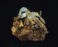Коллекция Систематическая коллекция, №10713. Друза из четырех голубоватых кристаллов с кварцем, альбитом, ортоклазом и слюдой.