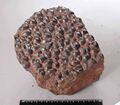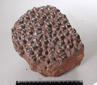 Коллекция Систематическая коллекция, №60929. Массивный агрегат скорлуповато-шестоватого строения, с одной стороны покрытый "буграми", напоминающими оплавленные кристаллы размером до 2см, а с противоположной такого-же размера и конфигурации "ямами". Размер образца 15х9х14см. Длина экспоната 17.0 см.