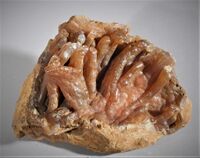 Коллекция Систематическая коллекция, №73213. Друза изогнутых, сросшихся псевдосталактитов халцедона длинной до 7см в окремненном известняке. Размер образца 20х15х10см. Длина экспоната 20 см.