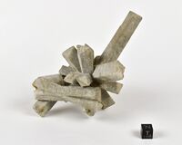 Коллекция Систематическая коллекция, №85646. Сросток 2.5-5 см длиннопризматических серых непрозрачных кристаллов с включениями карбонатных частиц и с 7.3 см центральным кристаллом.