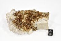 Коллекция Систематическая коллекция, №85652. Корочка коричневых 3-9 мм расщепленных кристаллов на кварце, мусковит, КПШ. 10х6х4 см.