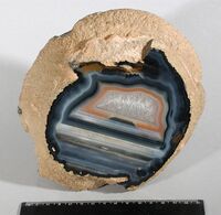 Коллекция Систематическая коллекция, №86620. Черно-серо-оранжевый агат с толстой ониксовой зоной, упирающейся в облекающую зональность внизу, переходящей в облекающую зональность вверху с кварцевым ядром. Частично вскрытая караваеподобная миндалина размером 18х16х9см со следами каолинизации газовых пузырей на поверхности. Длина экспоната 18.0 см.