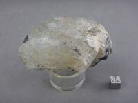 Коллекция Систематическая коллекция, №87924. Бесцветный прозрачный кристалл 9.5х7.5 см с трещинами и включениями мелких кристаллов шерла.