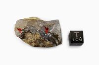 Коллекция Систематическая коллекция, №88051. Кристаллы до 2 см длиной, таблитчатые, желтовато-коричневого цвета в кварце. Очень хрупок, спайность по удлинению.