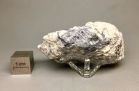 Коллекция Систематическая коллекция, №88918. Серые металловидные агрегаты с небольшим колличеством визуально неразличимого цинкенита. В кварце. Длина экспоната 6.0 см.Размер минерала 2.00 см.