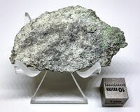 Коллекция Систематическая коллекция, №89658. Светло-зеленые примазки на породе. Примазки сложены очень мелкими кристаллами, до 0.1мм. Длина экспоната 5.5 см.