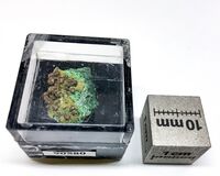 Коллекция Систематическая коллекция, №90580. Темно-зеленые очень мелкие (0.1мм) кристаллы с более светлым зеленым эвхлорином на светло-коричневом долерофаните. В пустотках отдельные пластинки федотовита. Hесколько мелких зерен золота. Бесцветные кристаллы - англезит. Длина экспоната 1.5 см.