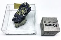 Коллекция Систематическая коллекция, №91212. Белые корочки алюмотунгстита, инкрустирующие полости в ферберите. Возможно среди этих корочек присутствует церотунгстит. Длина экспоната 2.0 см.Размер минерала 0.20 см.