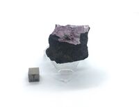 Коллекция Систематическая коллекция, №91308. Жемчужные чешуйки кассита на поверхности зеленого кристалла Cr-титанита, выросшего в прожилке в массивном хромите; поверхность прожилка инкрустирована фиолетовым кеммереритом Бесцветные прозрачные кристаллы среди кеммерерита - вероятно апатит. Длина экспоната 4.5 см.Размер минерала 0.10 см.