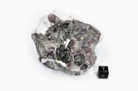 Коллекция Систематическая коллекция, №91654. Темно-вишневые изометричные зерна до 1.5см, окруженные коричневой каймой казаковита с анальцимом, уссингитом, крупными белыми пластинами натросилита, фосинаитом-(Ce), вуоннемитом, виллиомитом. Длина экспоната 9.0 см.Размер минерала 1.50 см.