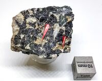 Коллекция Систематическая коллекция, №91783. Коричневатые зерна фторэденита в пегматоидном нефелиновом сиените. Длина экспоната 4.5 см.