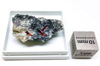 Коллекция Систематическая коллекция, №91873. Темно-зеленые до черного игольчатые кристаллы в нефелиновом сиените. Длина экспоната 3.0 см.
