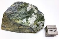 Коллекция Систематическая коллекция, №91913. Бесцветные тонкозернистые агрегаты суолунита, замещенные с поверхности пломбиеритом, кальцитом и тоберморитом в прожилках в измененном мервинит-шпинель- монтичеллитовом скарне. Белые мелкозернистые агрегаты в прожилке в основании образца - пломбиерит Длина экспоната 6.0 см.