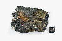 Коллекция Систематическая коллекция, №92397. Оранжево-коричневый радиально-лучистый сросток нормандита диаметром около 2см в зеленом эгирине вместе с золотистокоричневым астрофиллитом. С черным эгирином и белым альбитом. Длина экспоната 7.0 см.