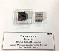 Коллекция Систематическая коллекция, №92674. Пучки тонкоигольчатых свинцово-серых с красноватыми рефлексами кристаллов размером до 0.5мм на вулканическом шлаке. Длина экспоната 2.0 см.Размер минерала 0.05 см.