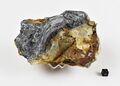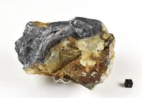 Коллекция Систематическая коллекция, №93029. Чешуйчатые агрегаты молибденита и сросток двух гексагональных пластинчатых кристаллов размером (в плане) 7 и 5 см в кварце Длина экспоната 15.0 см.Размер минерала 7.00 см.