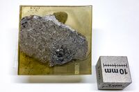 Коллекция Систематическая коллекция, №93499. Пласиковая запрессовка для микрозонда, содержащая образец с иринарасситом. Голотип. Длина экспоната 3.0 см.Размер минерала 0.01 см.