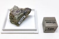 Коллекция Систематическая коллекция, №94318. Зеленовато-серый скрыто-волокнистый агрегат перманганогрюнерита в полосчатом доломитовом агрегате с пиритом, сфалеритом и кварцем. Длина экспоната 2.5 см.