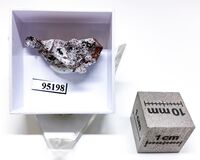 Коллекция Систематическая коллекция, №95198. Призматические хорошо ограненные кристаллы магнезиоферрифторгорблендита длиною до 2 мм в мелких полостях, инкрустированных кварцем (?) и (?) Длина экспоната 2.0 см.