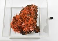 Коллекция Систематическая коллекция, №95680. Друза разноориентированных длиннопризматических до игольчатых кристаллов крокоита размером до 4 см в длину на породе. Длина экспоната 13.0 см.Размер минерала 4.00 см.