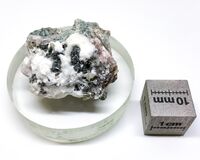 Коллекция Систематическая коллекция, №95716. Сыпь из темно-зелёных до черного мелкочешуйчатых сферолитов промежуточного члена ряда пумпеллит-(Fe3+) - пумпеллит-(Fe2+) размером до 2 мм на белом волокнистом окените и бесцветном кальците Длина экспоната 3.0 см.