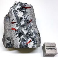 Коллекция Систематическая коллекция, №95800. Темно-зеленые до черного призматические кристаллы ферропаргасита размером до 1 см с зонами ферроэденита в альбитовом прожилке во флогопитовом слюдите. Длина экспоната 6.0 см.