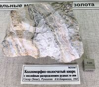 Коллекция Месторождения, №31567. РМ-63. Полосчатая кварцевая жила с послойным скоплением сульфидов и сульфосолей.
