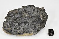 Коллекция Коллекция В.И.Степанова, №4018. Пучки серых 1,5-2 см плоских призм в плоскости сланцеватости филлитового сланца с мелкими призмами ставролита и тройниковой звездой, альмандин - зерна до 3 мм, частично замещенные крупночешуйчатым биотитом. Длина экспоната 9 см.