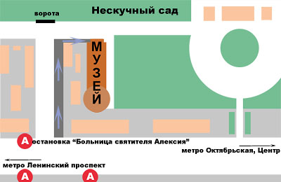From the subway station "Oktyabrskaya" take any bus (except е10 and e12) to the stop "Bolnitsa Svyatitelya Aleksia" then follow the path on the sketch map.